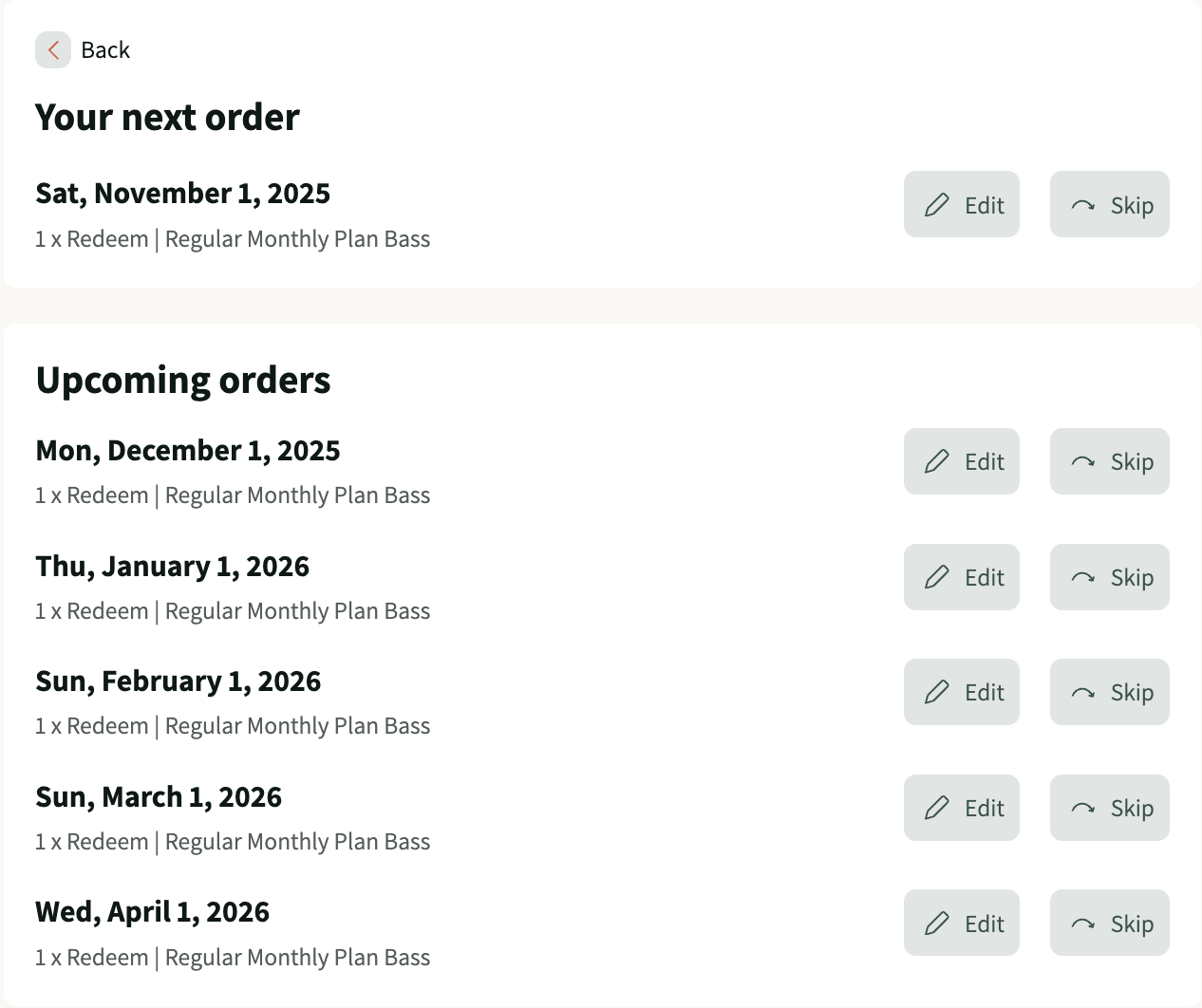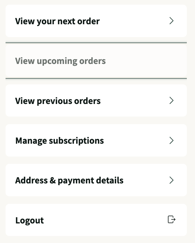 You can also view your shipping schedule, skip boxes, and change the species or shipping address, by clicking 'View Upcoming orders'
